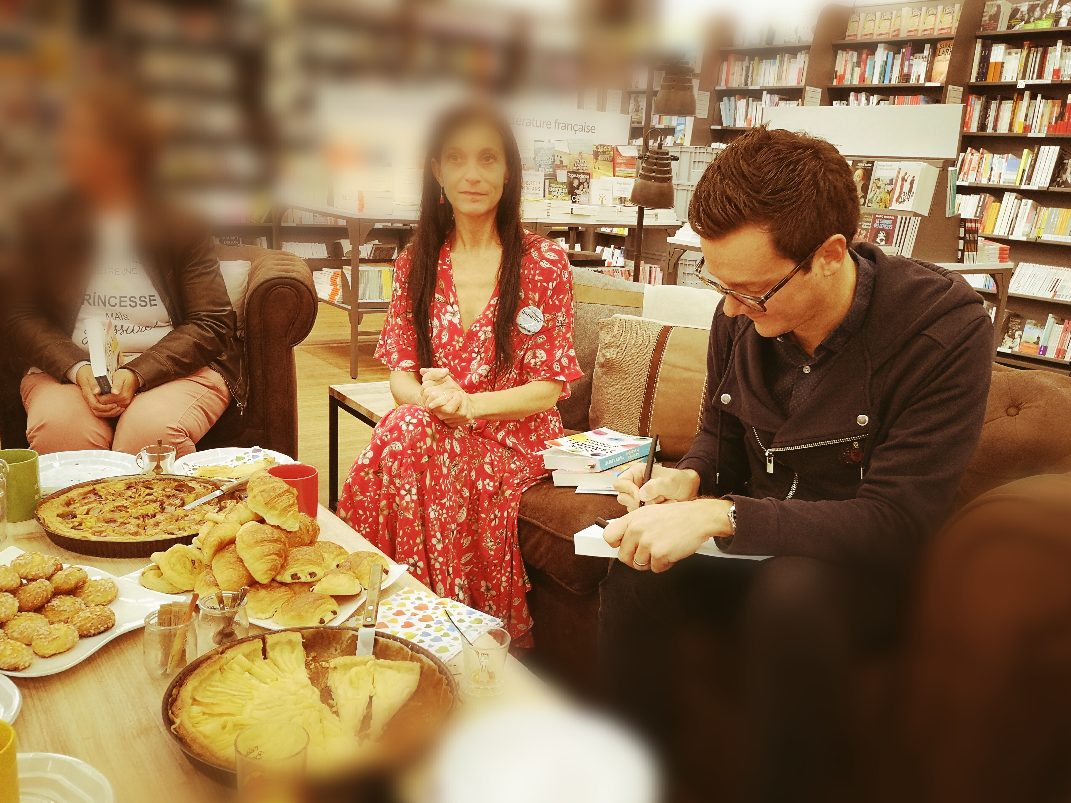 Nous sommes invités à prendre place dans un salon au rayon littérature. Nous prenons place sur les fauteuils ou chaises. Sur la table basse sont disposées des tartes faites par Sandrine – l’organisatrice de la rencontre – des chouquettes et des viennoiseries. Pour les accompagner, café, thé et jus d’orange nous sont proposés. L’auteur arrive et prend place, à côté de Sandrine, dans le grand canapé nous faisant face. Tous ensemble, nous formons un petit cercle, qui donne à cette rencontre un côté intimiste et singulier – atypique dans une si grande librairie !