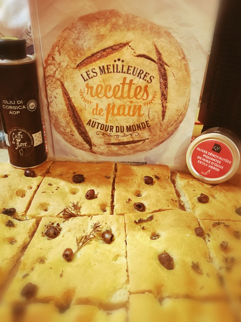Cette fois-ci, j’ai choisi une recette de focaccia, pour mettre l’Italie dans l’assiette ! J’ai utilisé des olives taggiasca ainsi qu’une huile d’olive corse, donc AOP.