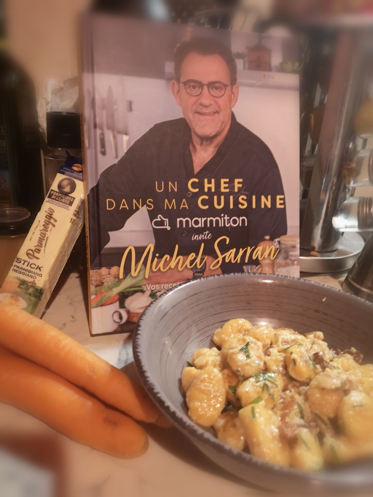 Hier soir, comme si j’étais invitée chez moi, mon cher et tendre a réalisé les gnocchis de carotte à la carbonara. Le pecorino a été remplacé par du parmesan, et le guanciale par du lard fumé au bois de sapin.