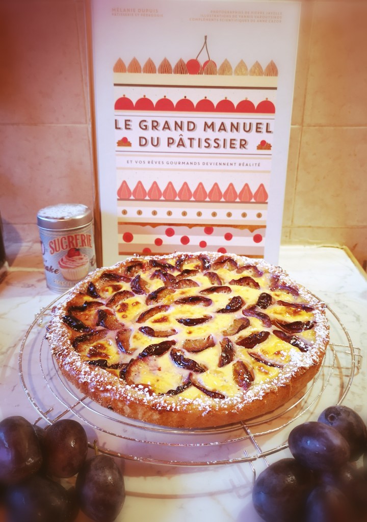 Une pâte simple à réaliser, à base de poudre d’amande et de sucre glace. Après un temps de repos au frais, j’ai fait mon fond de tarte, et disposé cette variété de prunes que j’affectionne particulièrement. Évidemment, comme vous le savez, je suis d’origine Alsacienne et je fais donc les tartes comme ma Maman me les a apprises, avec un flan qui vient napper les fruits.