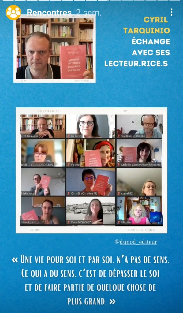 Le vendredi 9 juin a eu lieu la rencontre en visio avec Cyril Tarquinio, auteur du livre La santé ne tombe peut-être pas du ciel, que je vous ai présenté il y a quelques temps. Merci à Babelio et à la maison d’édition pour cette rencontre à distance !