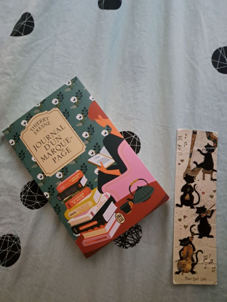 Je suis tombée sur ce livre à la caisse de la librairie, et il m’a tapé dans l’œil ! Que serions-nous sans notre marque-page ? Est-ce que vous gardez un seul marque-page qui vous suit dans chaque livre, ou prenez-vous pour toute nouvelle lecture un autre ? Moi, j’ai toujours le même qui me suis d’un livre à l’autre : une illustration de chats musiciens (merci Papa ❤️) et que j’ai déjà depuis plusieurs années. Je vous présente donc ce livre aujourd’hui !
